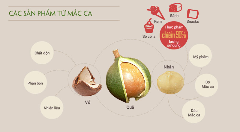 Vỏ mắc-ca có nhiều tannin và protein, dùng làm thuộc da và chế biến thức ăn chăn nuôi. Thành phần hữu ích chính của quả mắc-ca là phần nhân – được xếp vào hàng thượng phẩm trong “kho hạt” phong phú của xứ sở bánh ngọt phương Tây. Mắc-ca có vị béo, ngọt, giòn tan, trung hòa gia vị làm cho món ăn thêm đậm đà, thường được dùng để ăn sống, luộc hoặc xào nấu. Từ lâu mắc-ca đã được đưa lên bàn ăn của các gia đình giàu có hoặc yến tiệc sang trọng. Macadamia: Hạt ngon nhất, đắt nhất, Ẩm thực, Hat macadania, qua kho, hat mắc ca, mon ngon, kem sua, mon ngon de lam, qua hach,qua oc cho,Delix